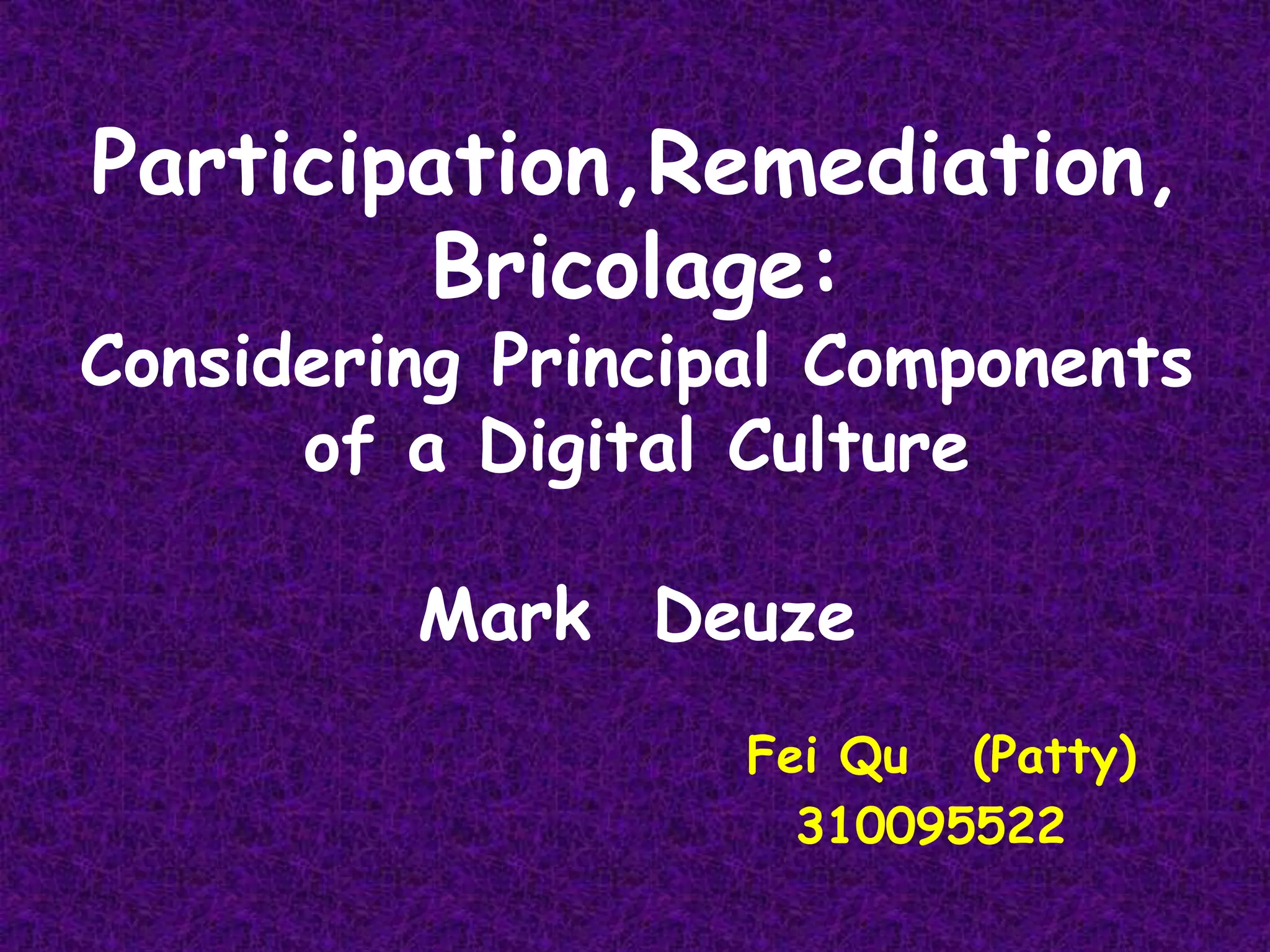 1) Participation, remediation, and bricolage are the three key components of digital culture according to the author.
