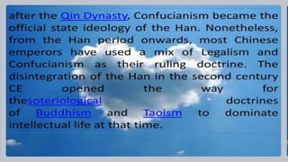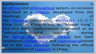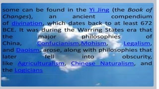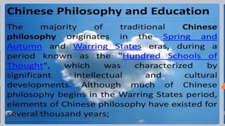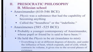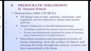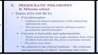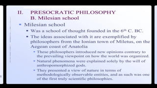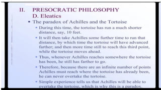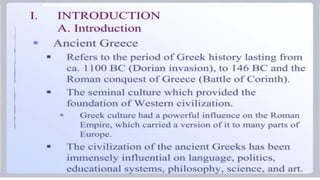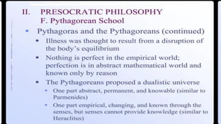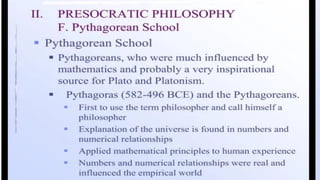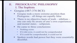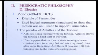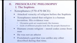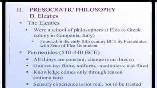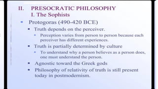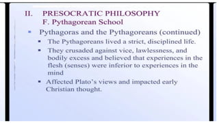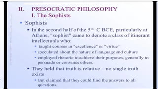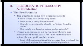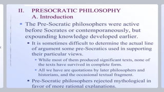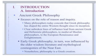 Socrates was an influential philosopher in ancient Athens who used questioning to challenge beliefs and was ultimately sentenced to death. Plato was Socrates' student and founded his own philosophical Academy. He believed in forms/ideas and advocated for a society ruled by philosopher kings. Aristotle was Plato's most famous student, tutored Alexander the Great, and founded his own school. He emphasized happiness and reason. After Aristotle, Greek philosophy declined due to political changes but schools like the Stoics and Epicureans emerged focusing on ethics and practical life issues. Philosophy became more eclectic and cosmopolitan.