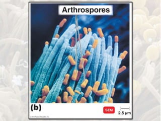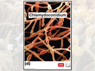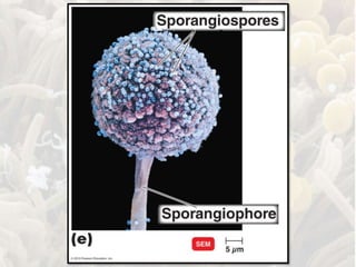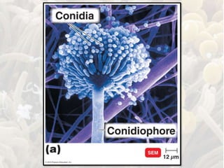 2. Key details include that fungi reproduce sexually through spores formed from the fusion of nuclei from two strains, and asexually through spores like conidiospores. Algae range from unicellular to multicellular and include economically important types. Protozoa are unicellular eukaryotes found in various habitats, some of which can cause diseases in humans.