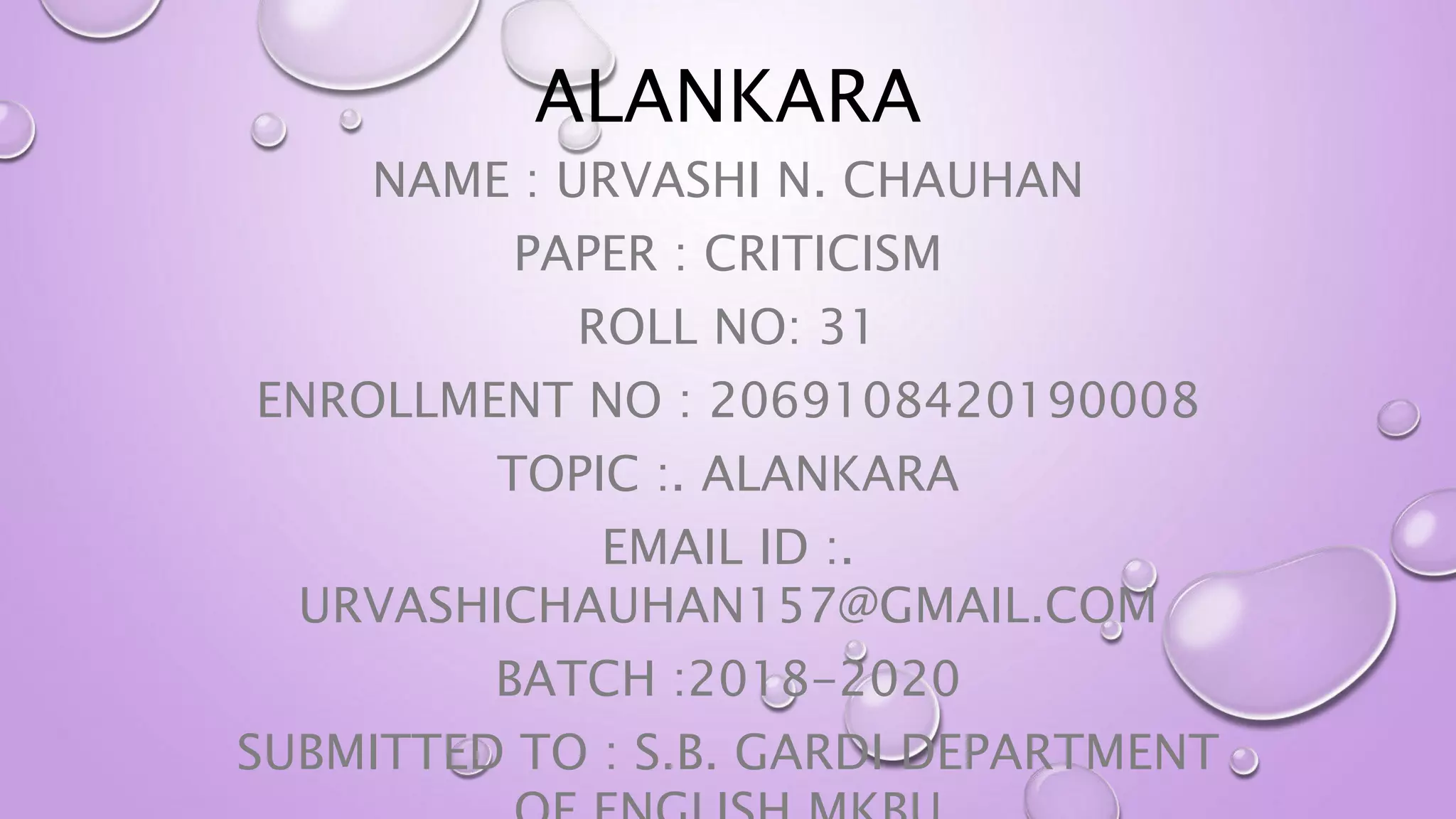 The document discusses different types of Alankara, or figures of speech, used in Indian literature. It divides Alankara into two categories - Artha Alankara related to meaning, and Shabda Alankara related to words. Some examples of Artha Alankara discussed are Upamalankara (simile), Rupakalankara (metaphor), and Pun (double meaning words). Examples of Shabda Alankara include Alliteration, Homonoms (using the same word with different meanings), and Yamak (repetition of words). The conclusion states that figures of speech modify language to increase the impact and effect of messages delivered.