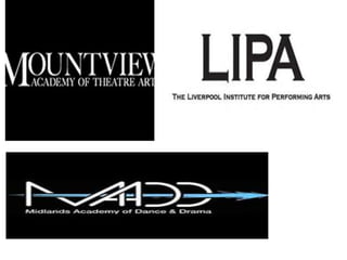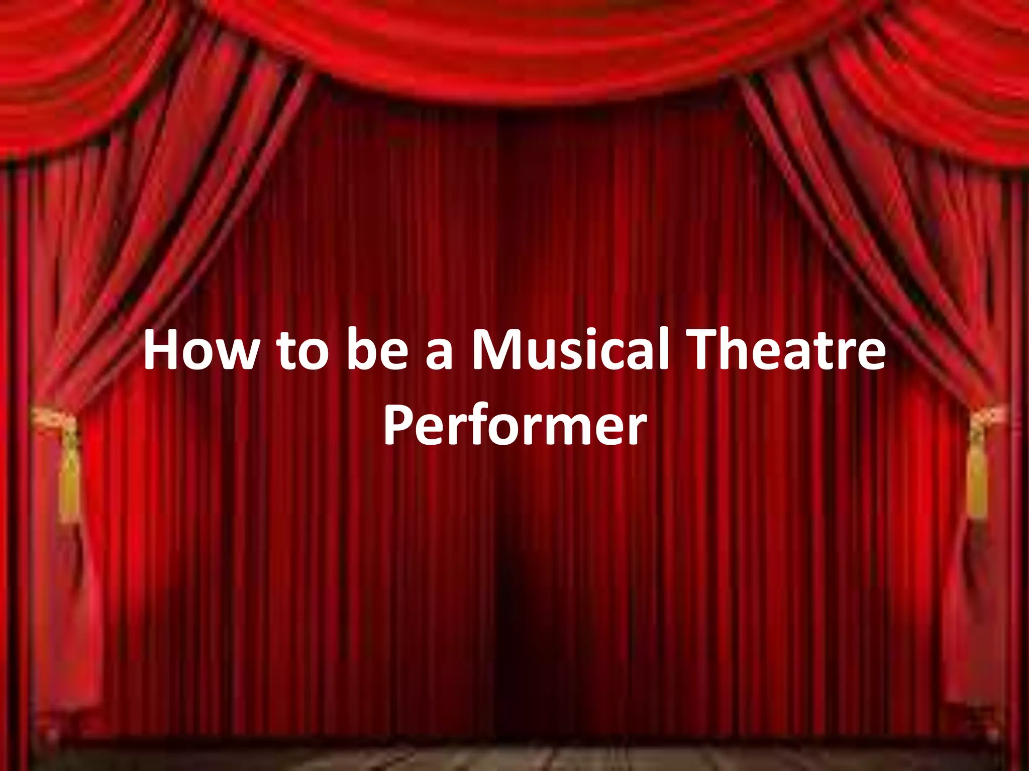 This document outlines the skills and training required to become a musical theatre performer. It discusses the three art forms of singing, dancing, and acting that must be mastered. Performers must be punctual and able to take direction and criticism. Training can occur at schools like Mountview or Lipa, which accept students through auditions and workshops. Musical theatre performers work with directors, choreographers, and other collaborators. Maintaining health, fitness, and balancing a career with personal life can also present challenges.