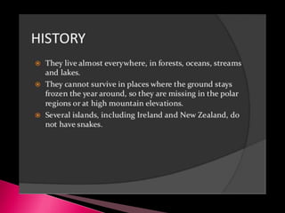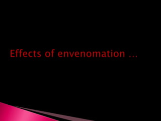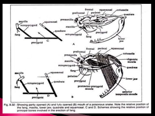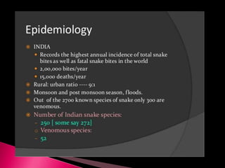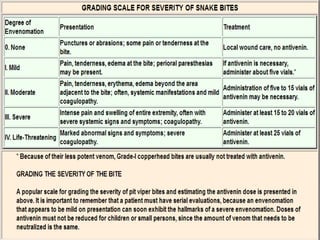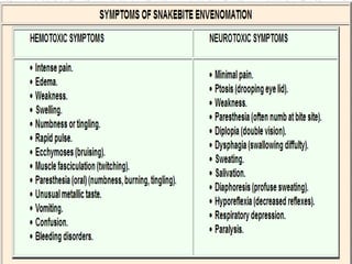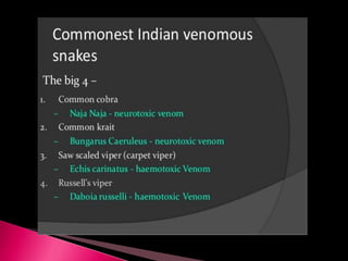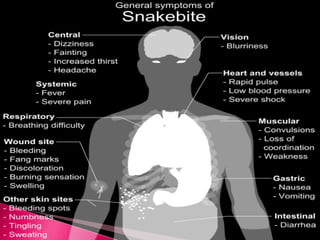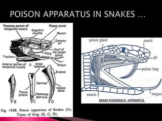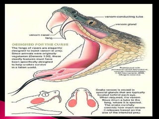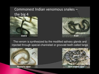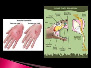 Snakes have well-formed biting apparatuses coupled with toxic venoms produced by poison glands. Their fangs are long, pointed, and hollow, allowing venom to be injected. The biting mechanism involves opening the mouth through muscle contraction, rotating the maxilla bone to erect the fangs, and then closing the mouth to inject venom. Snake venoms contain complex chemical mixtures including enzymes and proteins that can be neurotoxic, causing paralysis, or haemotoxic, resulting in tissue damage and hemorrhaging. The first aid treatment for a snake bite involves remaining calm, immobilizing the bitten area, seeking medical help, and avoiding actions like cutting the wound or sucking out venom.
