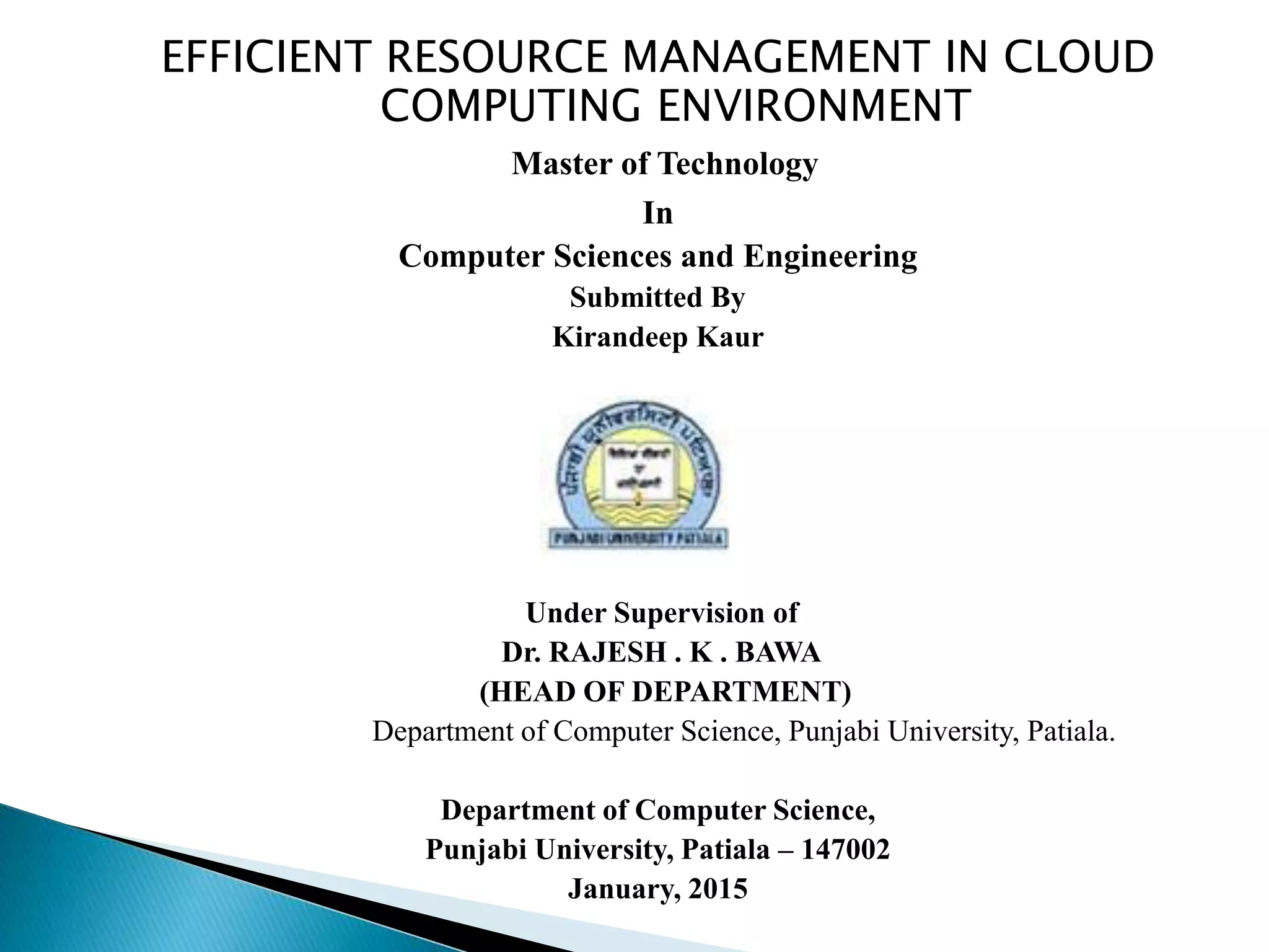 This document summarizes a thesis submitted to Punjabi University for a Master of Technology degree in Computer Sciences and Engineering. The thesis, written by Kirandeep Kaur and supervised by Dr. Rajesh K. Bawa, proposes a novel flexible resource scheduling model for public clouds to avoid resource starvation. It introduces the problem of resource starvation in cloud computing environments and reviews existing resource scheduling mechanisms. The proposed model aims to simulate a public cloud environment using CloudSim and demonstrate that no user request will starve without proper resource allocation through a flexible scheduling approach that considers server load.