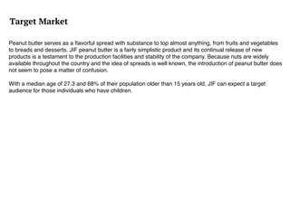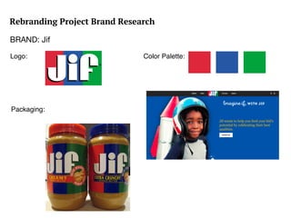 Jif is looking to rebrand and is researching its current brand, logo, packaging, and target market. The document provides an analysis of Jif's current brand and suggestions for improving it. It notes that the logo's colors and fonts are dull and the message is unclear. The new branding should have a simpler, cleaner, and more modern and interesting design that conveys healthiness. Color palette and fonts should be refined to be timeless and appealing to families with children. Mood boards and typeface options are presented.