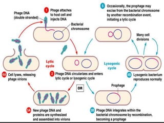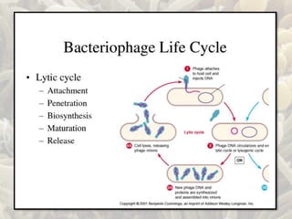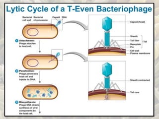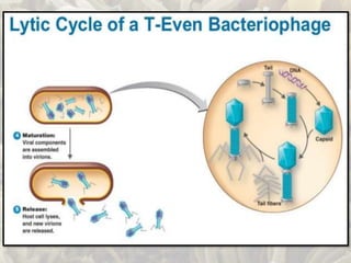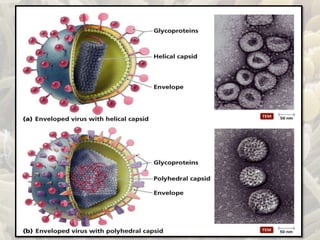 This document provides an overview of microbiology and viruses. It discusses that viruses are obligatory intracellular parasites that contain either DNA or RNA and multiply by using the host cell's machinery. Viruses come in a variety of shapes and sizes, and infect specific host cells through attachment and receptors. They undergo replication cycles inside host cells and are then released through lysis or budding. The document also notes that some viruses can cause cancer by inserting oncogenes into host cell DNA and transforming normal cells into tumor cells.
