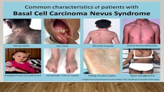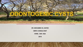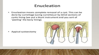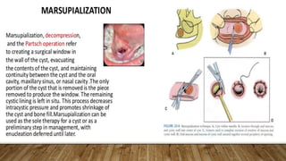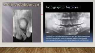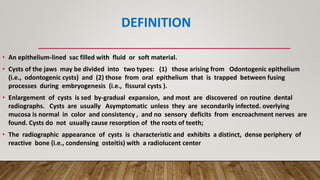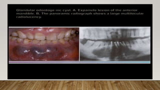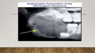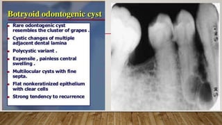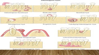 This document defines and classifies odontogenic cysts, which are epithelium-lined sacs that arise from odontogenic epithelium. It discusses the most common types, including periapical (radicular) cysts, dentigerous cysts, odontogenic keratocysts, glandular odontogenic cysts, and calcifying odontogenic cysts. For each cyst type, it describes characteristics such as prevalence, location, radiographic appearance, histopathology, treatment involving enucleation or marsupialization, and prognosis. It also discusses the basal cell nevus syndrome that can be associated with odontogenic keratocysts.