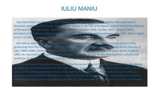 Iuliu Maniu was a Romanian politician who served multiple terms as Prime Minister of Romania between 1928-1930 and 1932-1933. He was born in 1873 in Bădăcin, Transylvania and studied law in Cluj, Budapest, and Vienna. Maniu began his political career in the Romanian National Party of Transylvania and was elected to the Hungarian parliament in 1906 as a deputy representing Alba County. He was also the long-time president of the National Peasant Party from 1926-1933 and 1937-1947 until being imprisoned after 1947, where he died in 1953 in Sighet prison.