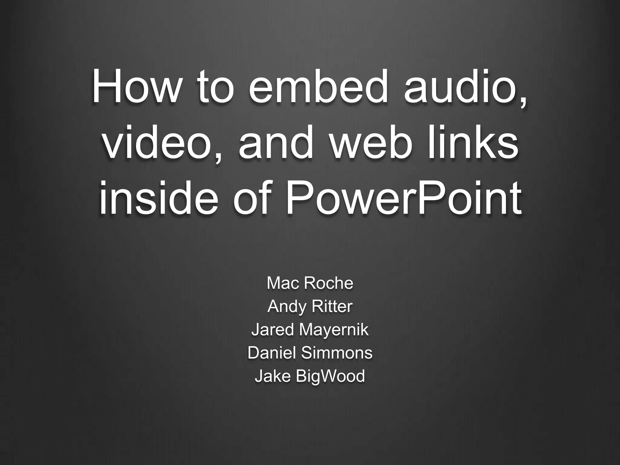 This document provides instructions for embedding various media types into PowerPoint presentations, including audio, video, and web links. It describes how to insert sound files and configure playback options, protect linked media files when moving presentations, and embed YouTube videos by copying the video URL. It also covers inserting web hyperlinks using action buttons.