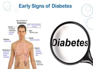 The document provides an overview of the history, definitions, classifications, signs and symptoms, complications, diagnosis, treatment, and management of diabetes mellitus. It discusses the role of insulin and pancreas in regulating blood sugar levels and classifies diabetes into types 1, 2, gestational, and pre-diabetes. The document also outlines dietary, exercise, medication-based, and self-management recommendations for diabetes.