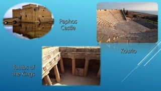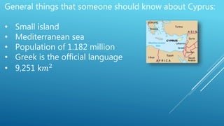 Cyprus is a small Mediterranean island with a population of over 1 million people, most of whom speak Greek as Cyprus' official language. In 1974, Turkey invaded and occupied 37% of northern Cyprus, displacing over 150,000 Greek Cypriots from their homes. Many areas like Famagusta remain empty ghost towns today as their original owners have been prevented from returning. Cyprus has a rich cultural tradition including traditional clothing, cuisine, arts and crafts, and is predominantly Christian Orthodox with many historic churches across the island.