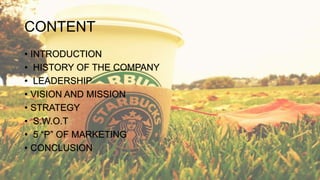 Starbucks is an American coffee company founded in Seattle in 1971. It grew rapidly in the 1980s and 90s under the leadership of Howard Schultz, who brought Italian cafe culture to the US by selling espresso. Starbucks focuses on quality coffee, customer experience in its stores, and has a global presence through over 30,000 locations worldwide. It differentiates itself from competitors through its coffeehouse atmosphere and customer loyalty programs.