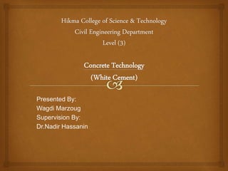 White cement is used for architectural concrete and other construction applications where a bright, consistent color is needed. It allows for a wide range of light colors. The final color of concrete is affected by the cement, aggregates, admixtures, and finishing used. White cement meets ASTM specifications and contains less than 0.5% ferric oxide to maintain its brightness. It is used for architectural elements, floors, pools, and other finished concrete products.