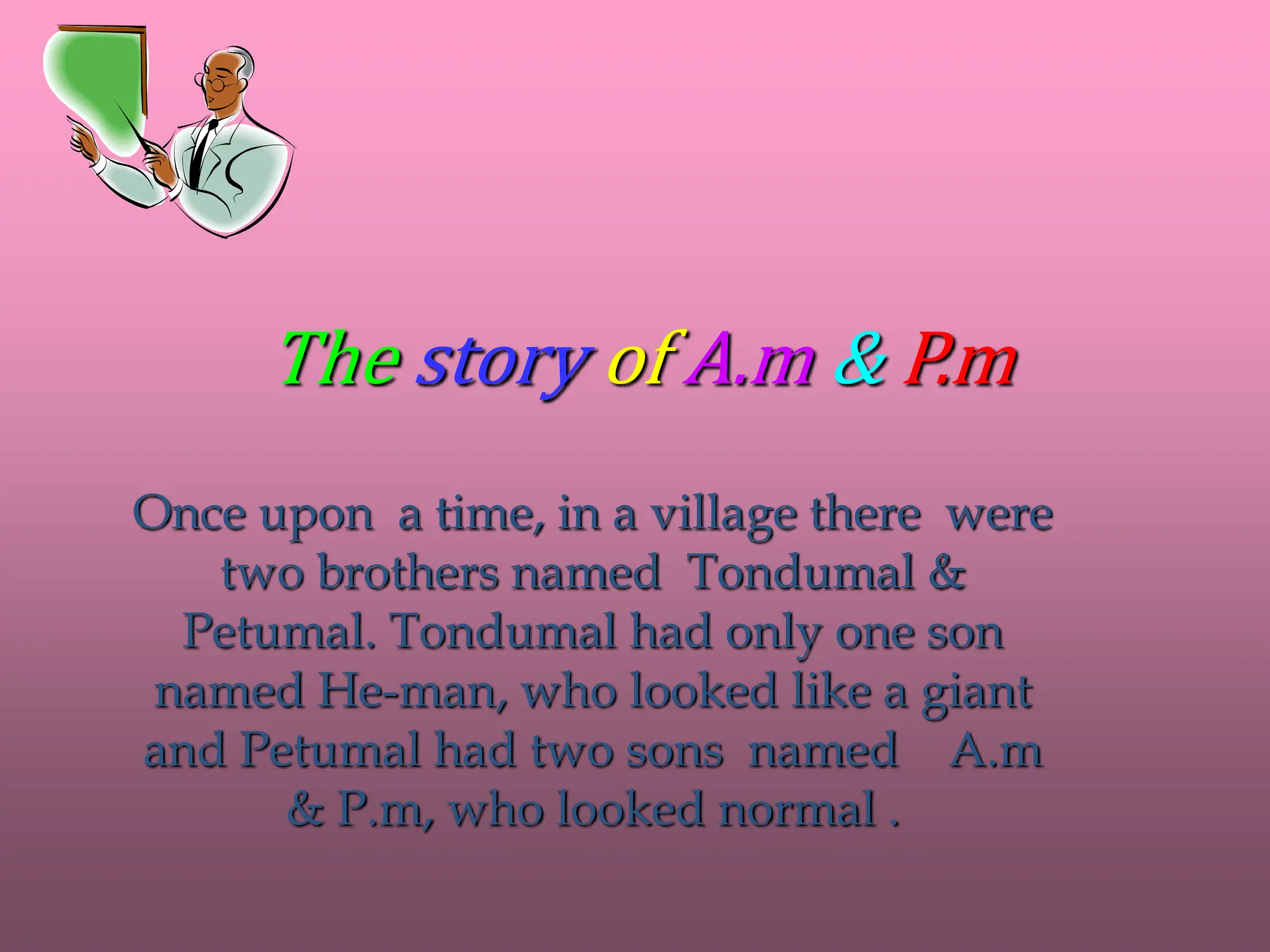 The story follows two brothers, a.m and p.m, who race against their powerful cousin, he-man, using a strategy of running one by one to outlast him. Despite he-man's strength and initial lead, a.m and p.m manage to continuously alternate running, symbolizing the passage of time as they represent a 12-hour clock against he-man's 24-hour clock. Ultimately, the race never truly ends, reflecting the ongoing movement of time represented by clocks.