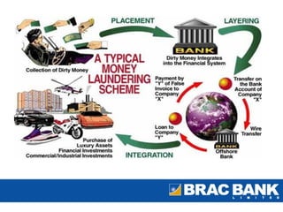 The document discusses money laundering prevention. It outlines the objectives of increasing awareness of anti-money laundering responsibilities and regulations. Non-compliance can result in penalties like imprisonment, fines, license revocation and more. Key aspects of money laundering prevention covered include know-your-customer procedures, suspicious transaction reporting, and the importance of monitoring transactions for consistency with customer profiles.