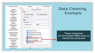 The document discusses the importance of data presentation, analysis, and interpretation in thesis writing, emphasizing that proper data processing is essential for a clear argument. Key steps include data cleaning, which ensures accuracy, quality, and validity of results, and data transformation for suitable analysis formats. Ultimately, these processes enhance the integrity and credibility of the research findings.