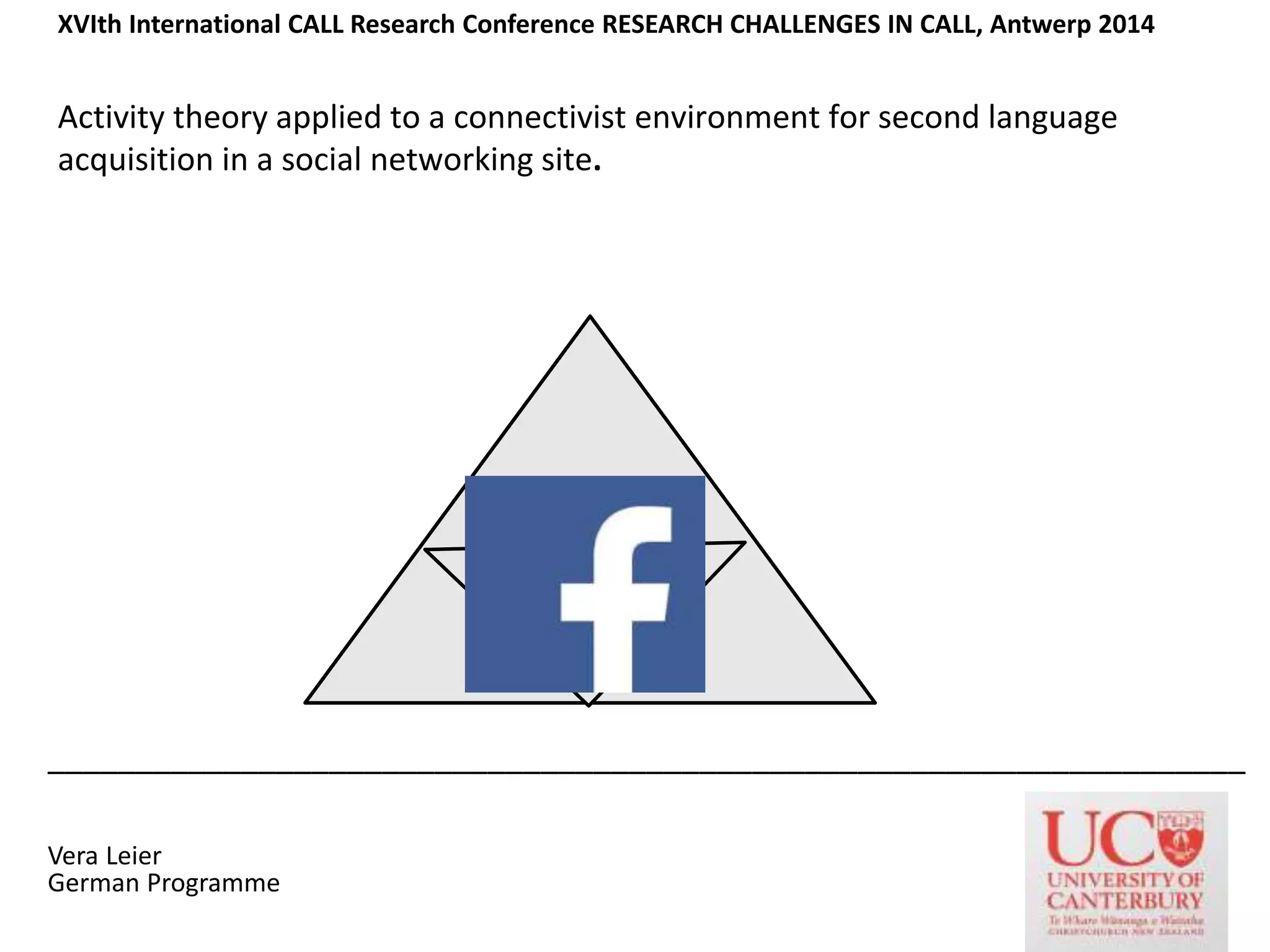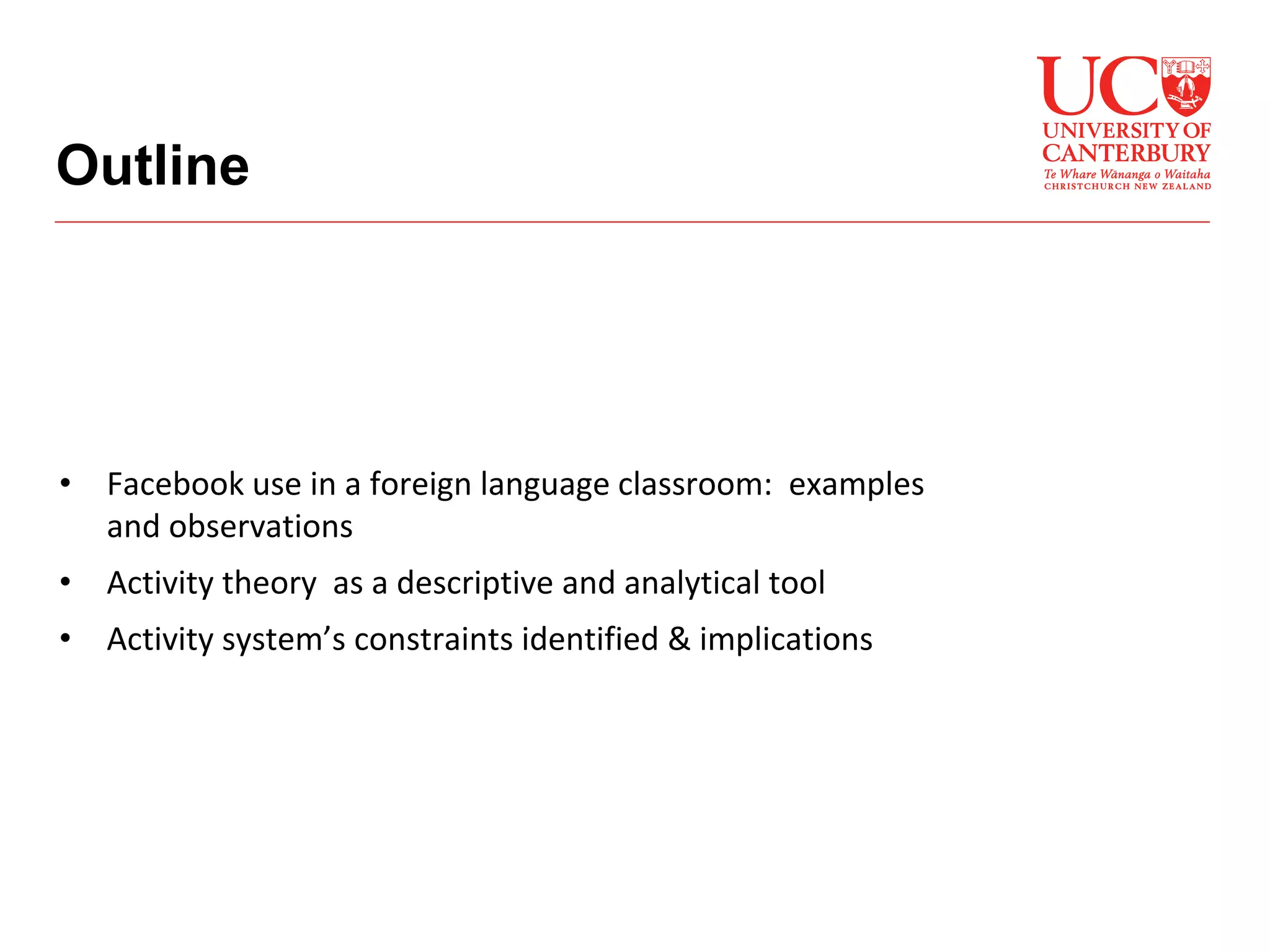 This document summarizes research on using Facebook to support second language acquisition in a German language class. An activity theory framework was used to analyze student participation on the Facebook group. Questionnaires and observations revealed several contradictions between components of the activity system, such as students feeling uncomfortable posting on Facebook for educational purposes due to seeing it as a personal social media site. The research aims to understand how social networking sites can be effectively integrated into language learning by resolving constraints identified through an activity theory analysis.