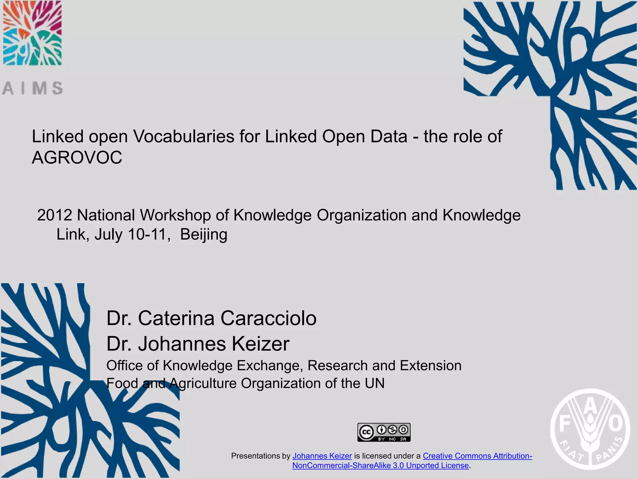 The document discusses the role of AGROVOC, an open linked vocabulary developed by the Food and Agriculture Organization (FAO) of the United Nations. It describes FAO's goal of making agricultural knowledge available globally and highlights key dynamics shaping information aggregation and distribution. It then demonstrates FAO's initiatives to link diverse data sources and develop applications like OpenAGRIS using AGROVOC as the backbone vocabulary to integrate information on topics like rural populations, cereal yields and fisheries. FAO is working to realize a vision of seamless access and sharing of agricultural data through linked open vocabularies and technologies.