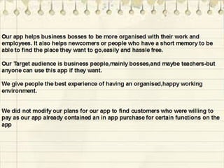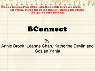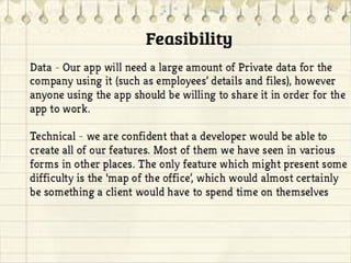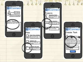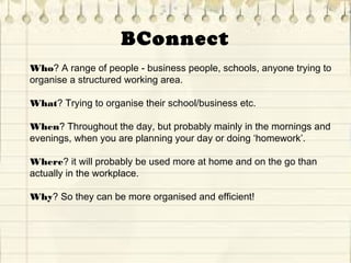 BConnect is an app being developed by the team Kandy Kittens to help businesses and individuals better organize their work. The app would allow users to map offices, store and assign files to projects/contacts, and manage schedules. This would help with tasks like scheduling project teams, communicating between departments, and managing tasks from colleagues. The app aims to interconnect employees to make managing their work lives more efficient. It combines features of apps like Dropbox, Skype, and todo lists, but connects them specifically to the business for organized collaboration between colleagues.