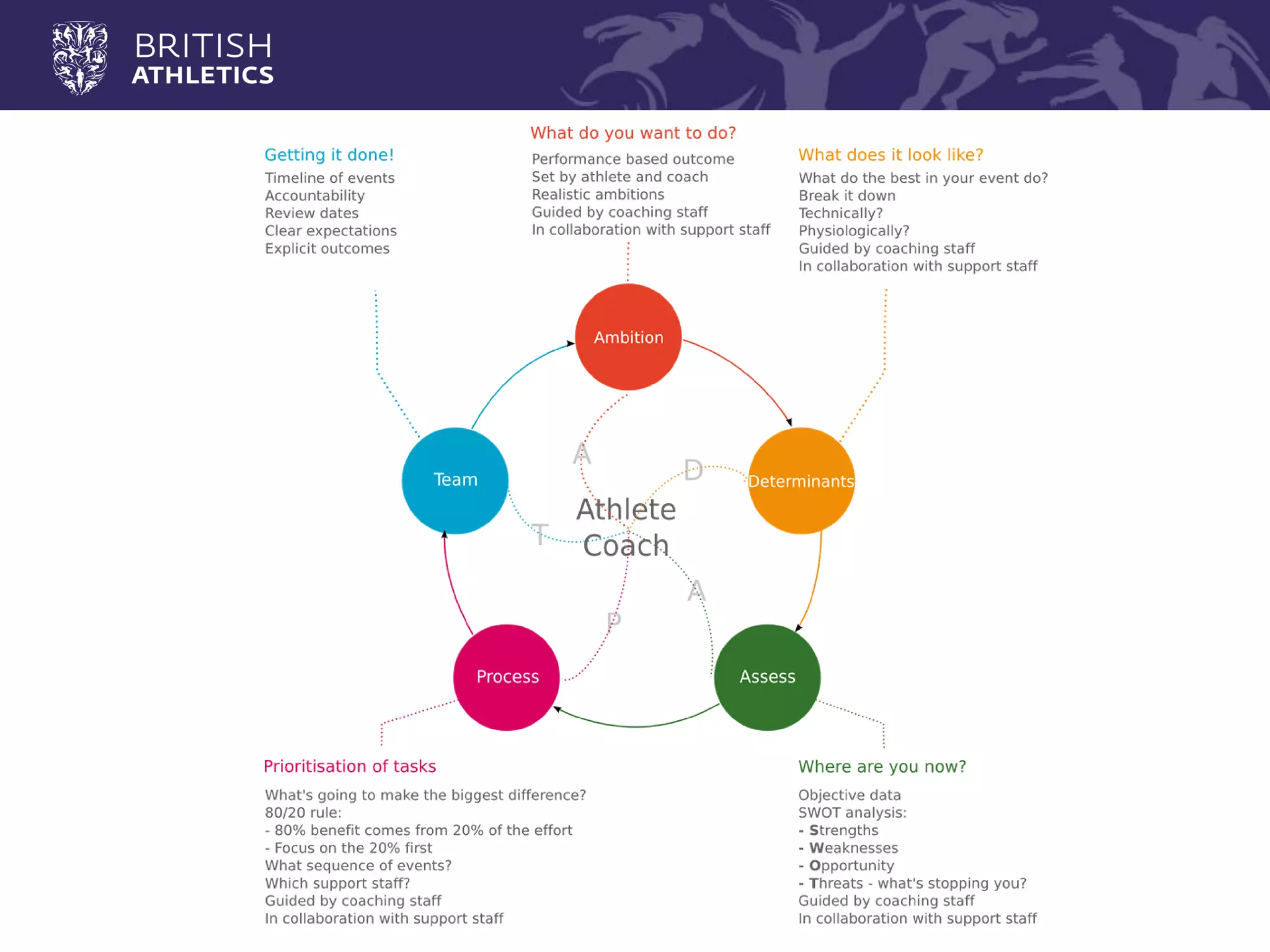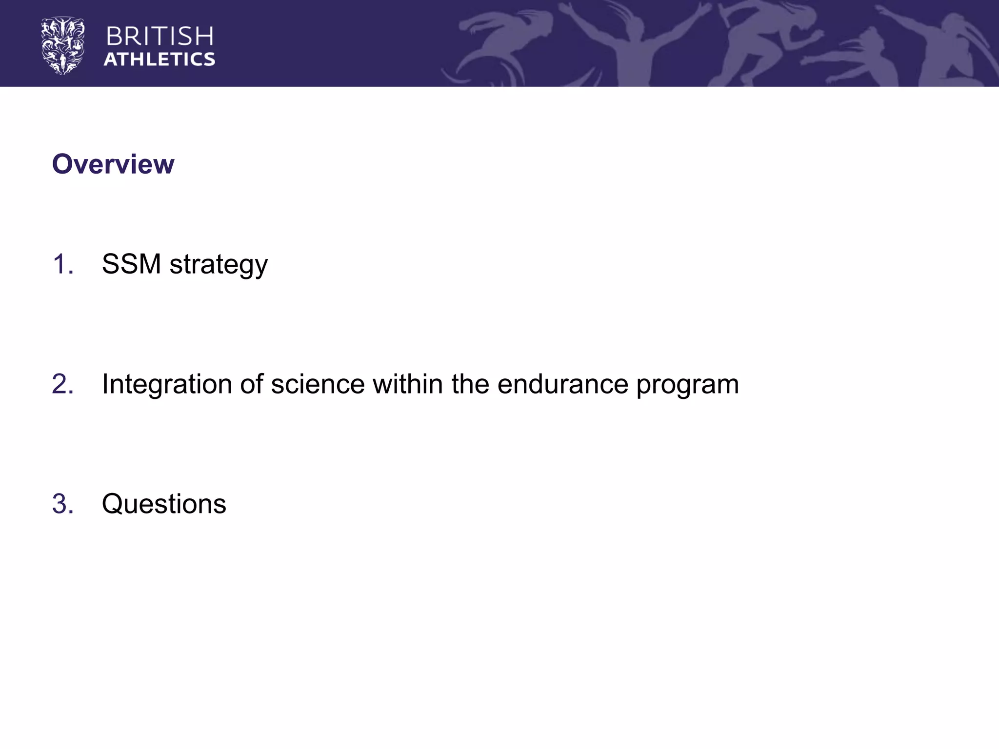 The document outlines the strategy and vision for the integration of sport science in training and performance for track and field athletes, aimed at achieving medal success in upcoming championships. It emphasizes the importance of tailored support, collaboration, and effective communication among coaches and athletes to optimize performance and manage injuries. The plan includes specific performance targets and proposed initiatives for athlete development leading up to major events like the 2016 Rio Olympics and 2017 London World Championships.