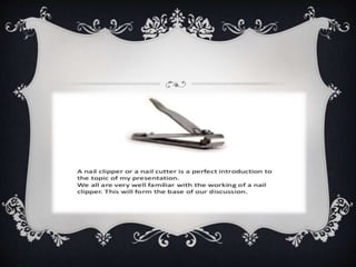 This presentation summarizes different types of clipper circuits. It defines clippers as circuits that can clip off or remove unwanted portions of an input waveform without distorting the rest. The presentation describes series and parallel/shunt clipper circuits, and provides examples of unbiased and biased series and parallel clipper circuits. It explains how different clipper circuits work and lists some applications of clippers such as changing waveform shapes and circuit transient protection.