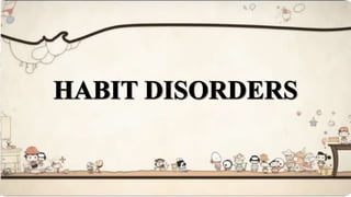 This document provides an overview of behavioral disorders in children. It begins with an introduction stating that normal children are well-adjusted when their emotional, physical and psychological needs are met. It then defines behavioral problems as significant deviations from socially accepted norms. The main causes and various types of behavioral disorders are discussed, including habit disorders, speech disorders, eating disorders, sleep disorders, personality disorders, and anxiety disorders. Specific behavioral disorders like enuresis, encopresis, nail biting, thumb sucking, pica, anorexia nervosa, bulimia nervosa, somnambulism, sleep talking, nightmares, stuttering, and school phobia are then defined and their causes, signs/symptoms