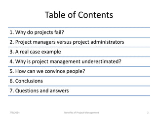 The document discusses the benefits of project management. It notes that 32% of projects are successful when using project management techniques, compared to 24% that fail without it. A case study is presented where a website project went over budget and late without a project manager to perform key tasks like requirements gathering and scope management. Reasons project management is underestimated include thinking the project is too small or that a manager is too expensive. The document advocates using data on project failures and costs to convince people of the value of project management.