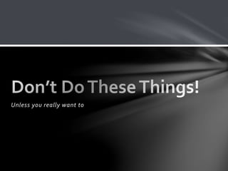 The document provides tips for effective presentations. It recommends using standard fonts like Times New Roman or Arial instead of unusual fonts. Too much text or too many words per line can make slides hard to read. The main message should not be lost due to poor font or slide design choices. PowerPoint should reinforce the spoken presentation, not replace it. Effective presentations are well-planned with sections, titles, and content on slides, not just walls of text.