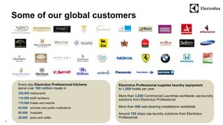 Electrolux Professional serves a vast array of global customers, including restaurants, hotels, and hospitals, providing innovative food and laundry solutions with a focus on sustainability and cost reduction. The company has experienced significant sales growth, with a net sales increase from SEK 4,400 million in 2008 to SEK 5,550 million in 2013, while maintaining a commitment to operational excellence and product innovation. Through partnerships and advanced technologies, Electrolux aims to enhance customer profitability and reduce environmental impact.