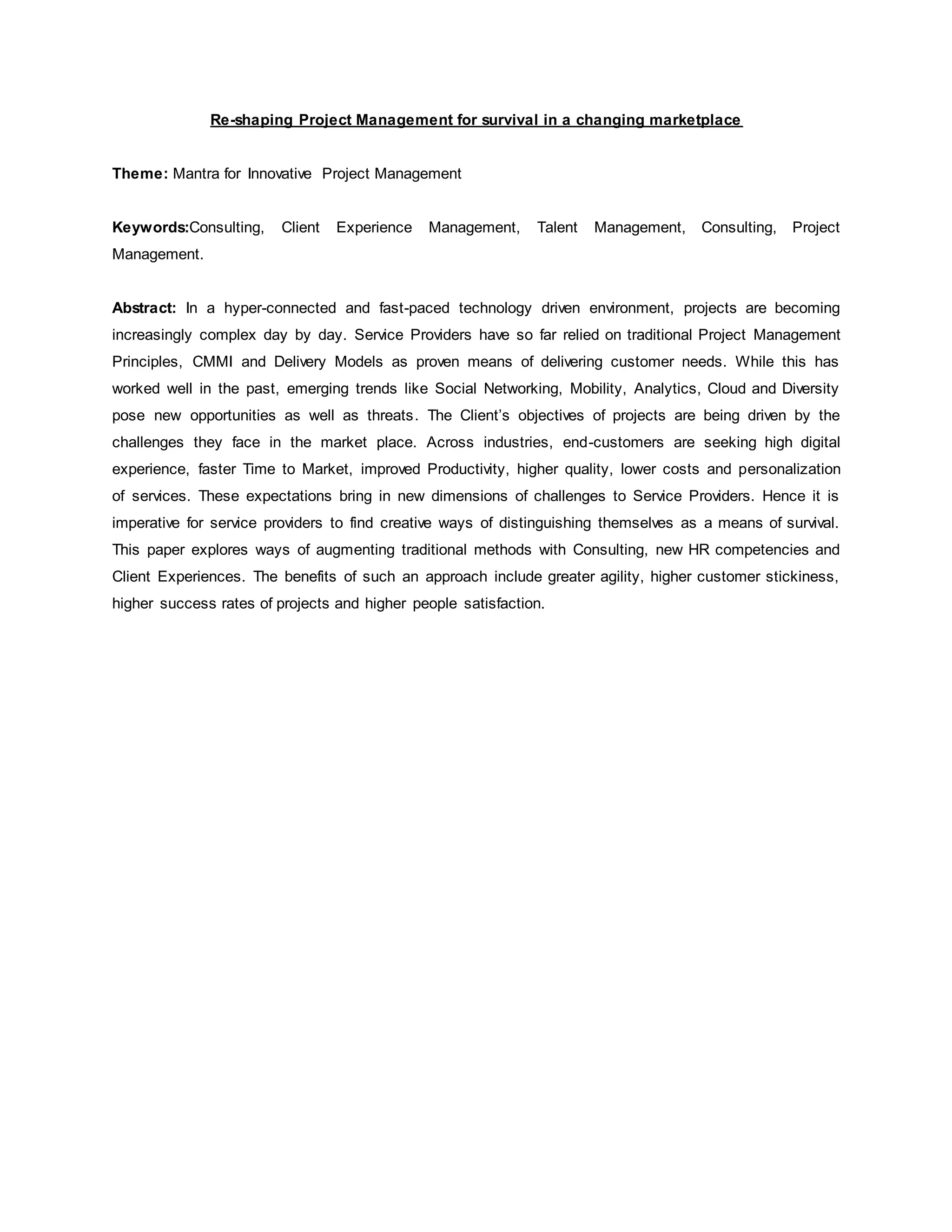 This document discusses how project management needs to evolve to address changing trends in the business environment. Traditional methods of stakeholder management, communication, and human resources management need to transform into deeper client engagement, articulating client value, and talent management. Project delivery also needs to incorporate more consulting approaches. Additionally, innovation, consulting skills, and social technologies can help augment traditional project management. These changes will help organizations better engage customers, deliver higher value, and ensure project success in today's dynamic marketplace.