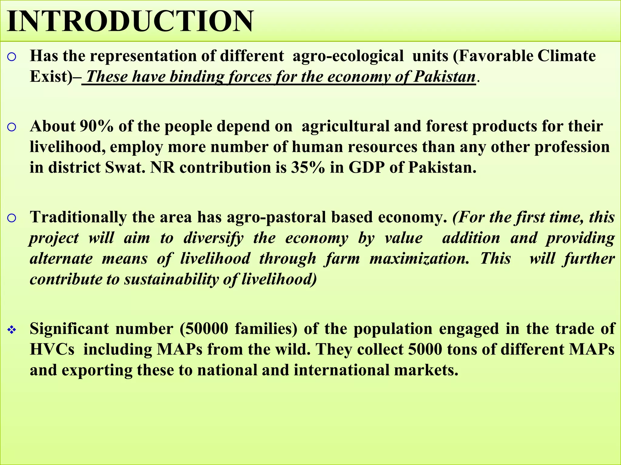 The project aims to enhance farm income and livelihood opportunities in district Swat, Pakistan, through the introduction of high value crops, particularly medicinal plants. With a focus on community mobilization and capacity-building, the initiative involves training local farmers, establishing demonstration plots, and developing marketing channels, thereby encouraging sustainable agricultural practices. An extension of the project is recommended to further support economic growth and alleviate poverty in the region.