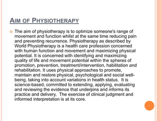 Physiotherapy is a dynamic healthcare profession focused on restoring movement and function, especially after injury, illness, or disability. It employs diverse treatment techniques, including exercise and manual therapy, to enhance individuals' physical potential and overall well-being. Physiotherapists play a crucial role in health promotion, pain management, and prevention across various medical disciplines.