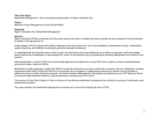 This document discusses stakeholder management strategies for the successful implementation of India's Right to Education Act. It argues that stakeholder engagement and community mobilization are key, as seen in the success of India's polio eradication campaign. Specifically, establishing effective school management committees and increasing parental involvement can help address ongoing challenges like low learning outcomes and the enrollment of economically disadvantaged children. Proper monitoring of schools is also needed to ensure compliance with the act in practice, not just on paper. With coordinated efforts among all stakeholders, including government, schools, communities and volunteers, the goals of universal elementary education can be achieved.