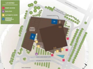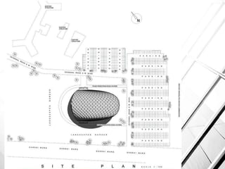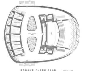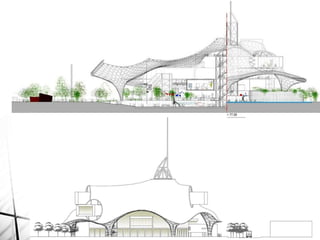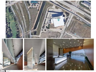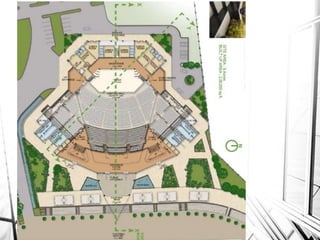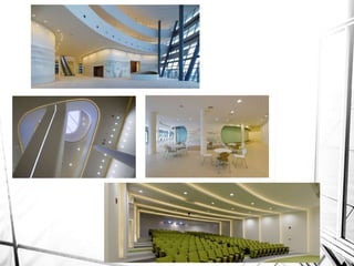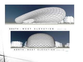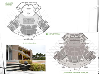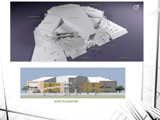 The document summarizes several prominent convention centers around the world, detailing their architectural designs, capacities, functionalities, and sustainability features. Key highlights include the Victor Menezes Convention Center in Mumbai, the Kongu Convention Center in Tamil Nadu, Zayed University in Abu Dhabi, and the Centre Pompidou in Metz, France. Each center aims to meet varied client needs while promoting energy efficiency and multi-purpose usage within their structures.