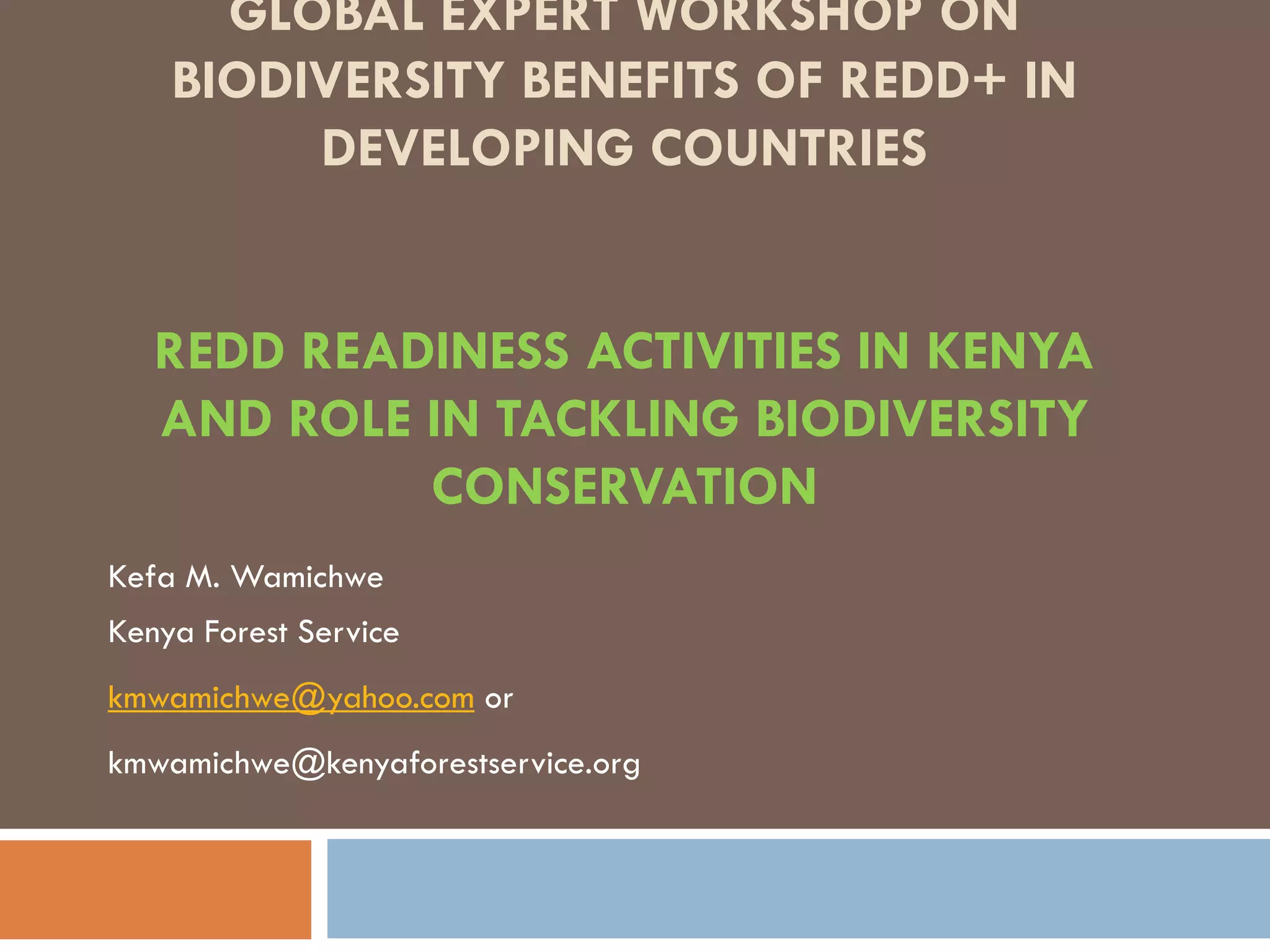 Kenya has initiated REDD+ readiness activities to address deforestation drivers like agricultural expansion, unsustainable forest resource use, and overgrazing. The country is developing a REDD+ strategy and reference emissions level through stakeholder consultation. Proposed interventions include improved forest governance, alternative livelihoods, and community benefit sharing from forest conservation. Key challenges include establishing baselines and monitoring systems for carbon and biodiversity, and generating cross-sectoral support for REDD+ implementation. Water tower forests like Mau are prioritized for restoration and carbon market investment to supplement conservation efforts.
