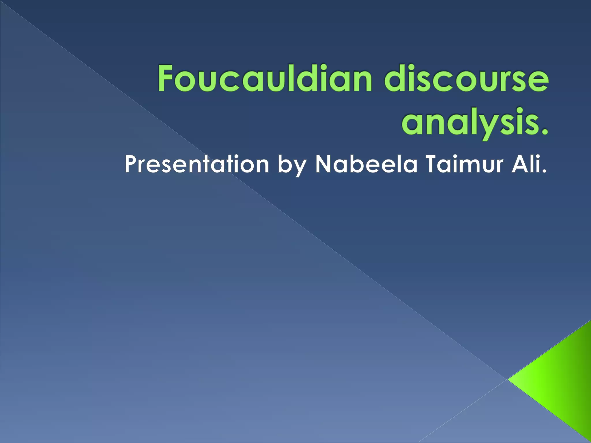 Critical discourse analysis (CDA) focuses on analyzing written or spoken language to reveal power relationships in society. It is based on theories from Michel Foucault and the Frankfurt School. CDA examines how language constructs social realities in ways that maintain inequalities. The approach considers both what texts include and omit, and how power relations are expressed and reproduced through language and discourse. The goal is to uncover hidden assumptions and ideologies to challenge social injustices.