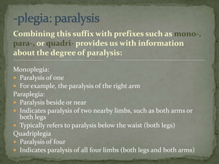 The document provides examples of medical terminology suffixes and how they are used to describe conditions related to the nervous system. The suffixes -plegia, -esthesia, and -paresis are discussed. -Plegia indicates paralysis and can be combined with prefixes to specify the degree, such as monoplegia meaning paralysis of one limb. -Esthesia refers to sensation, with examples like anesthesia meaning without sensation. -Paresis describes weakness, such as hemiparesis meaning weakness on one side of the body.