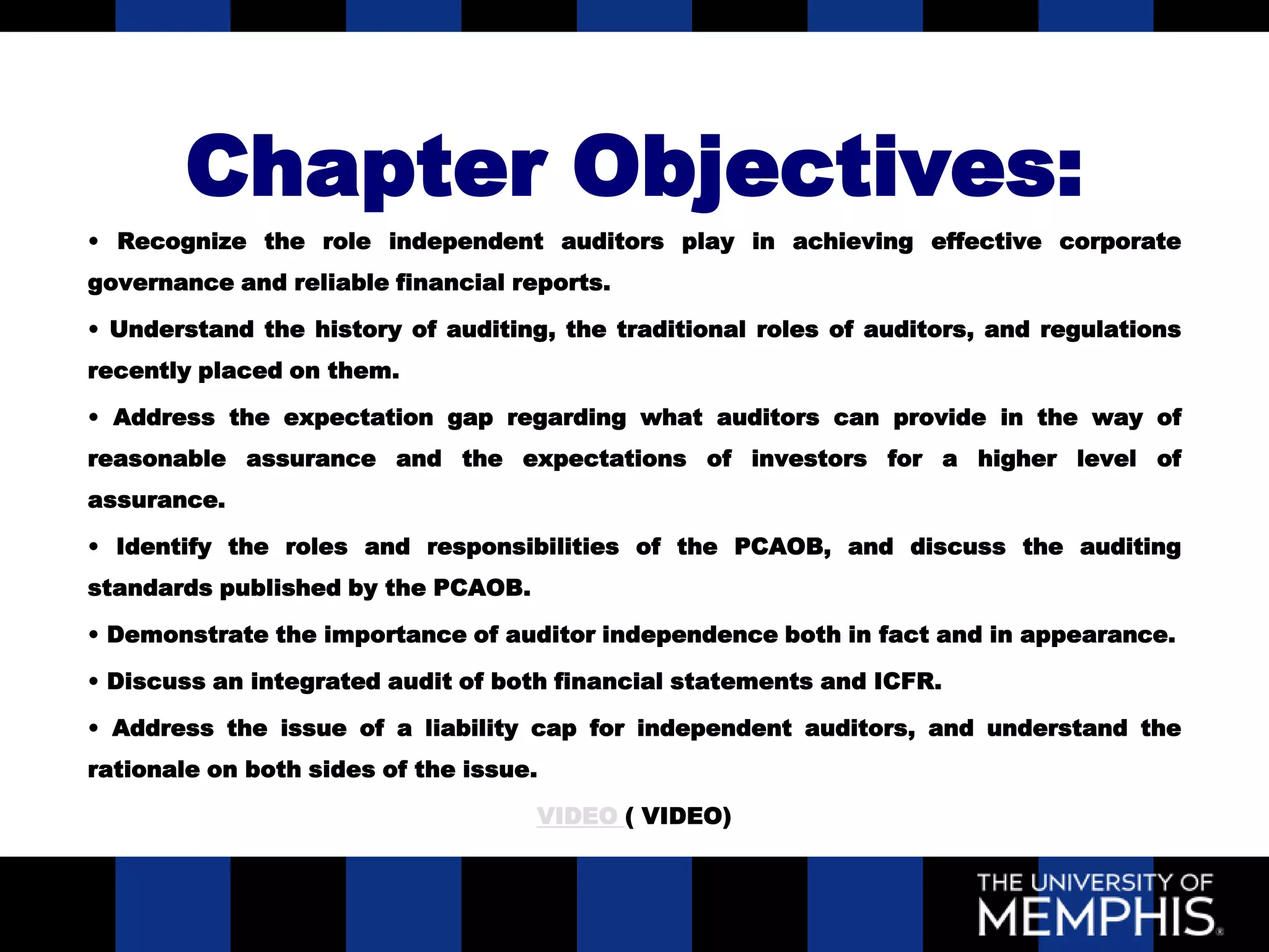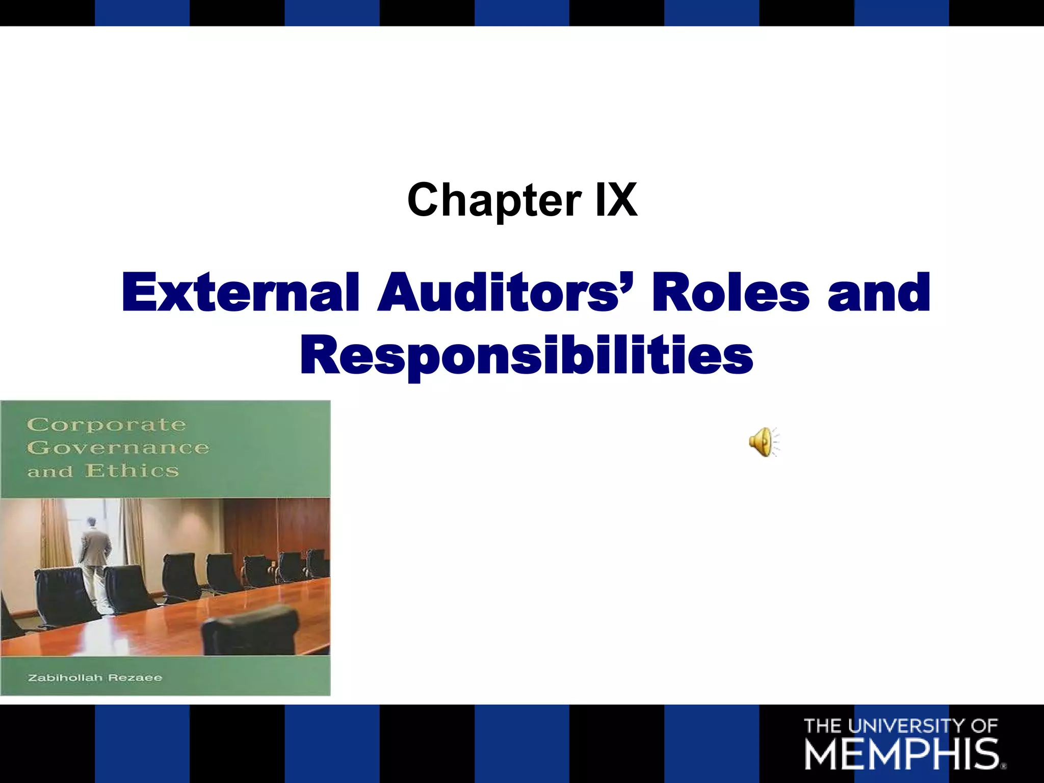 This document discusses the roles and responsibilities of external auditors. It begins by explaining that external auditors provide reasonable but not absolute assurance that financial statements are free from material misstatement. It then covers auditor competency, the different types of audit reports, and the purpose of the audit report. Finally, it discusses public company oversight by the PCAOB and key auditing standards. The document provides an overview of the expectations and regulatory requirements for external auditors.
