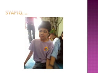 This document contains information about an individual named Ahmad Syafiq bin Mohd Taufiq. It includes his personal details such as date of birth, age, address, parents' names and occupation. It also describes his medical condition of hydrocephalus and the surgeries he has undergone. Finally, it lists observations about his abilities and difficulties related to communication, attention, motor skills and other areas.