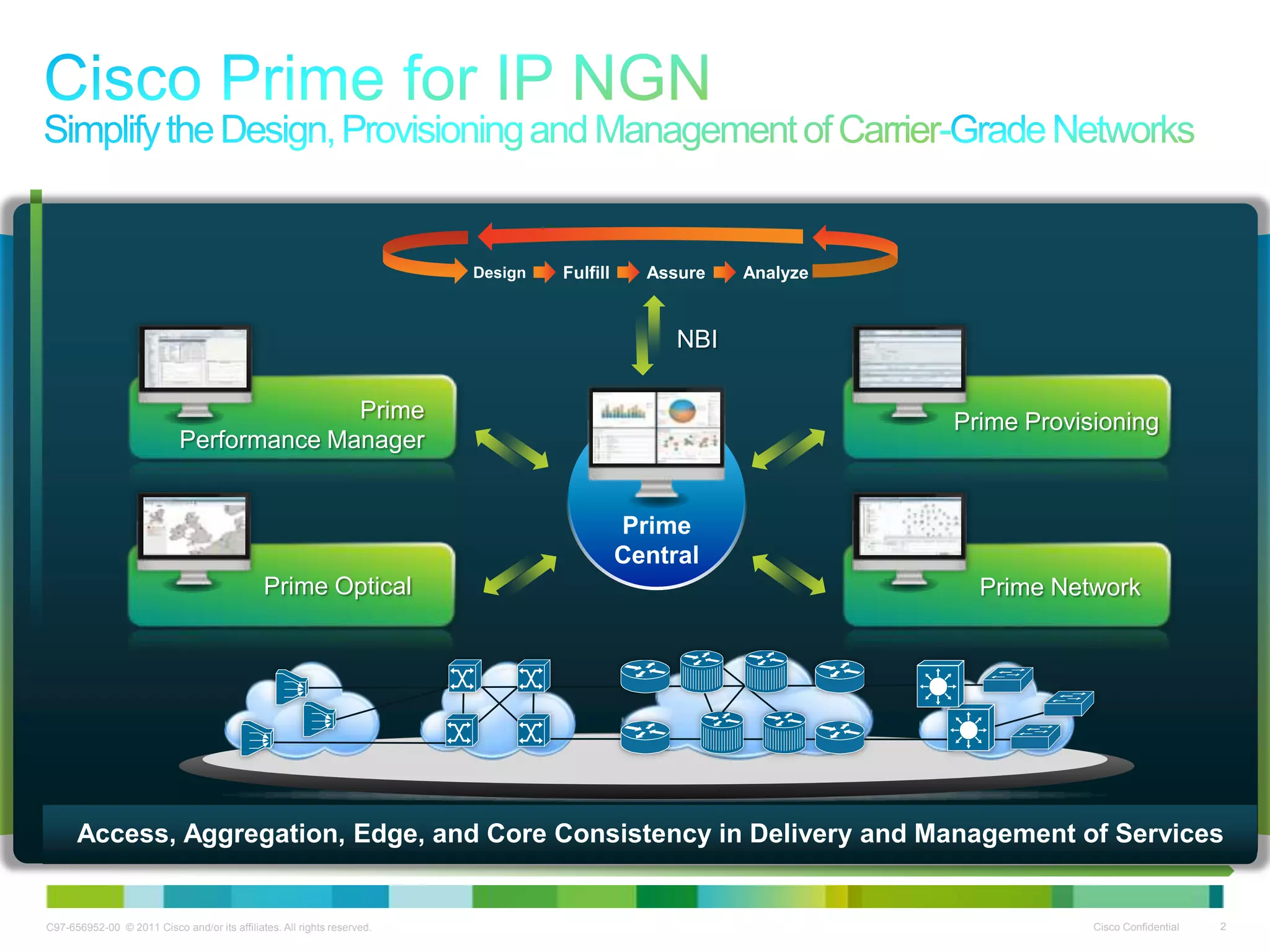 The document presents an overview of Cisco Prime for IP NGN, detailing its architecture and capabilities for managing and assuring network services. It emphasizes the integration of various network elements, efficient inventory management, and robust alarm correlation to enhance operational efficiency. Key benefits include reduced troubleshooting times and improved service delivery in evolving network environments.