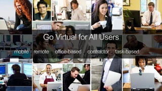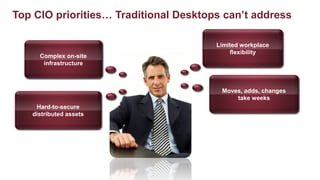 The document discusses Citrix's approach to desktop virtualization, highlighting its services that enable flexible work environments and enhance security and productivity. Key offerings include desktop as a service, virtual desktops, and centralized app management, which allow for dynamic access across various devices. Citrix maintains a leading market position with over 9 million licenses sold and partnerships aimed at improving user experience and reducing costs.
