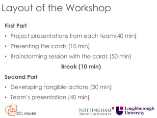 The workshop will have two parts. The first part will involve project presentations from each team, presenting consumer-focused strategy cards, and a brainstorming session using the cards. There will then be a short break. The second part will consist of developing tangible actions based on the brainstorming session, followed by presentations from each team on what they learned and improved during the workshop by using the cards. The strategy cards are a tool to brainstorm ideas to better communicate, collaborate and innovate with consumers and stakeholders to promote sustainable consumption and behaviors.