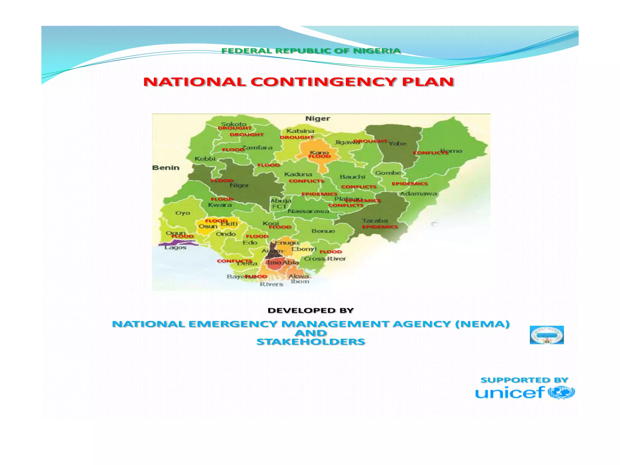The document outlines Nigeria's National Contingency Plan which was developed by the National Emergency Management Agency (NEMA) and stakeholders to coordinate humanitarian response to major disasters for an initial 10 day period. The plan addresses floods, droughts, conflicts, and epidemics. It was supported by several previous plans and frameworks. The contingency plan provides an overview of coordination and standard operating procedures. It also discusses challenges including capacity issues, inter-agency rivalry, and lack of awareness. NEMA is responsible for coordinating disaster management in Nigeria through its various departments which focus on prevention, preparedness, search and rescue, and relief.