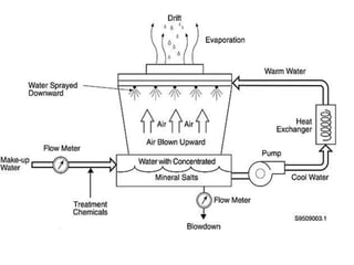 The document discusses the history and scientific development of cooling tower design theory. It begins by explaining how Merkel developed the first scientific theory for evaluating cooling tower performance in 1925. It then provides definitions of key cooling tower concepts like approach, range, and heat transfer methods. The document goes on to describe parameters like tower characteristics, fan power requirements, and water loss factors. It also summarizes Merkel's assumptions and the development of generalized supply equations from manufacturer curves.
