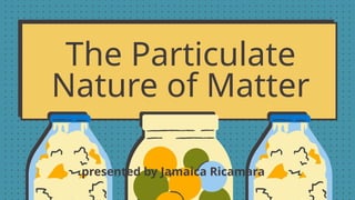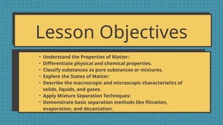 The document covers the particulate nature of matter, including its properties, states (solid, liquid, gas, plasma), and methods of separating mixtures. It distinguishes between physical and chemical properties, as well as pure substances and mixtures, detailing examples of each. Additionally, it explains physical separation techniques such as filtration, distillation, and chromatography.