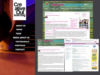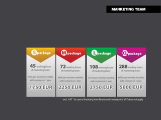This document discusses an Amsterdam-based creative production agency that was founded as a branch of a marketing agency in Sarajevo, Bosnia and Herzegovina. The agency offers a wide range of creative services including graphic design, video production, web design, mobile apps, and photography. It works with international clients from the Netherlands and Bosnia and Herzegovina in industries such as consumer goods, tobacco, and telecommunications. The agency aims to provide high quality creative services to Dutch clients at significantly lower prices by outsourcing production to Bosnia.