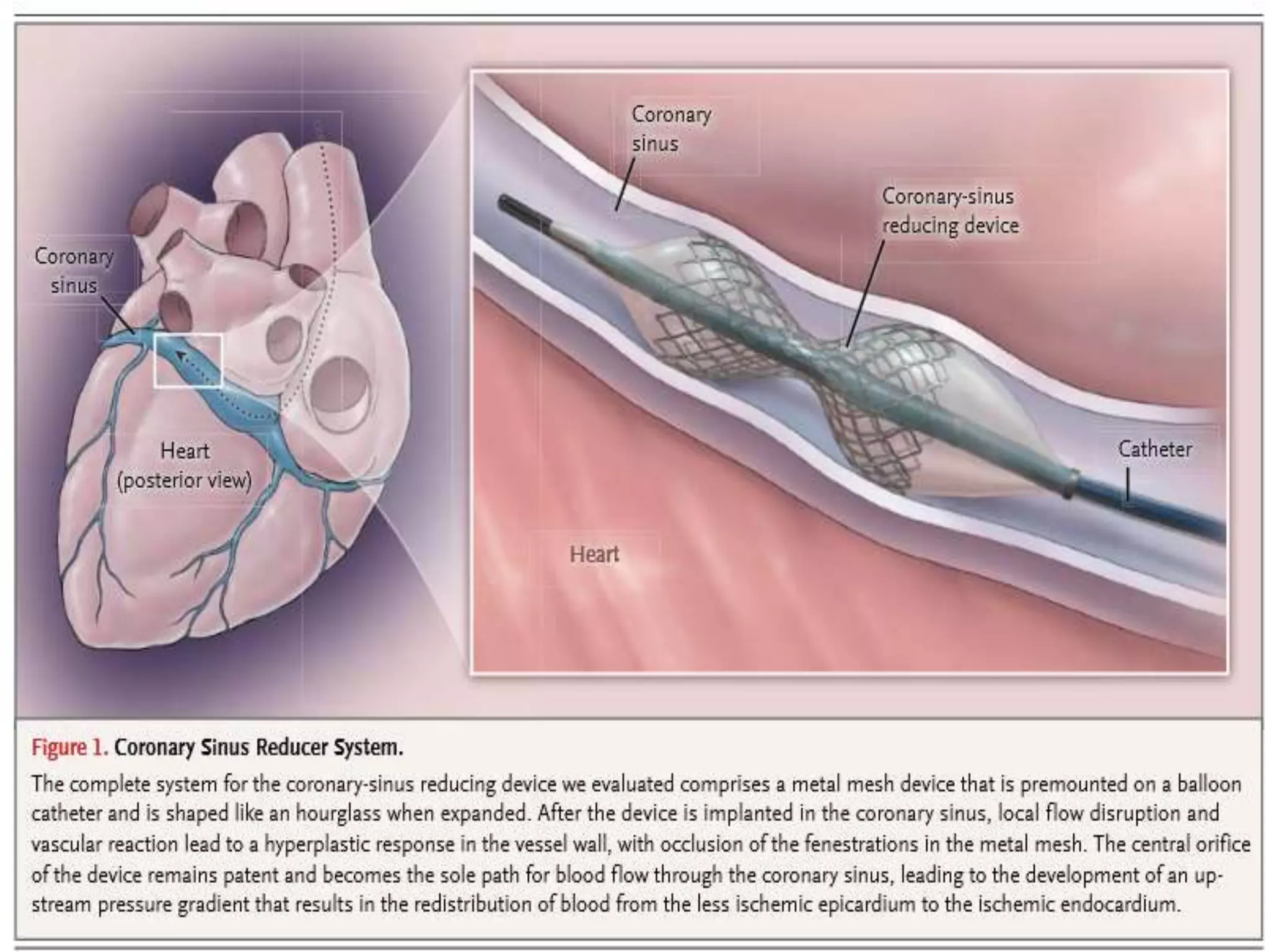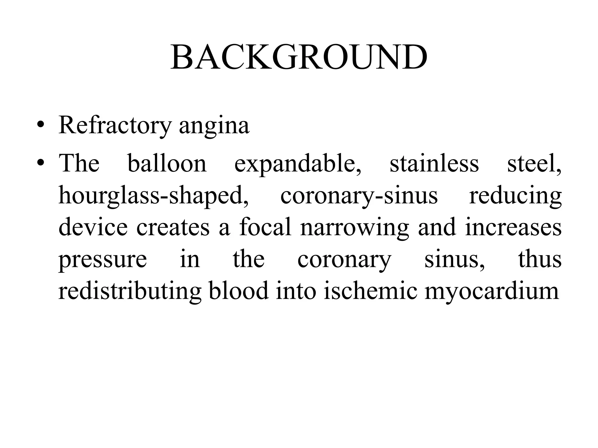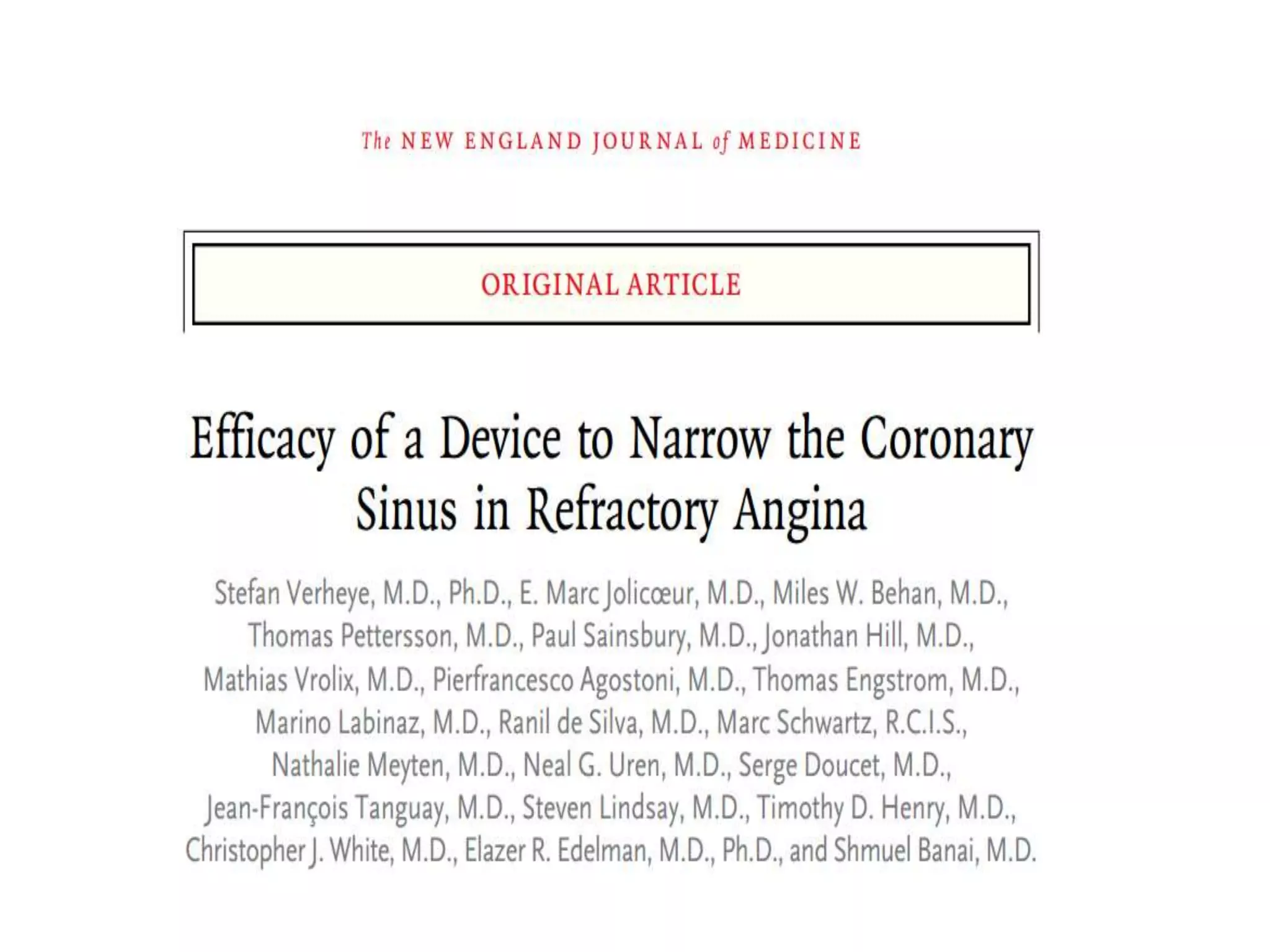 This document summarizes a clinical trial testing a coronary sinus reducing device for the treatment of refractory angina. The trial involved 104 patients randomized to receive the hourglass-shaped device, which creates pressure in the coronary sinus to redistribute blood flow, or a sham procedure. At 6-month follow-up, the device led to reduced angina symptoms and improved quality of life compared to the sham group, as measured by the Seattle Angina Questionnaire and Canadian Cardiovascular Society class. The results provide preliminary evidence that increasing coronary sinus pressure may help relieve angina by recruiting collateral blood flow.