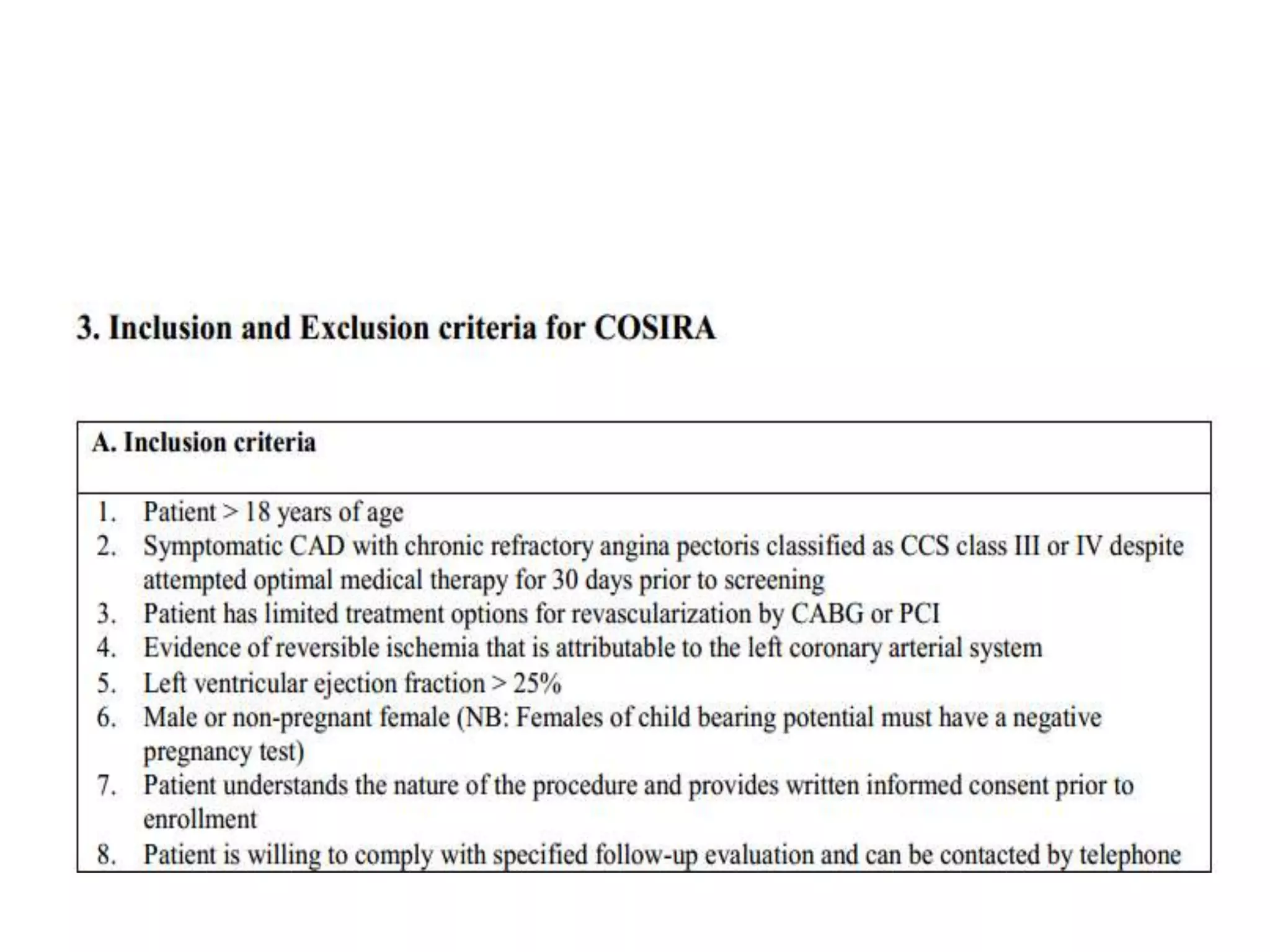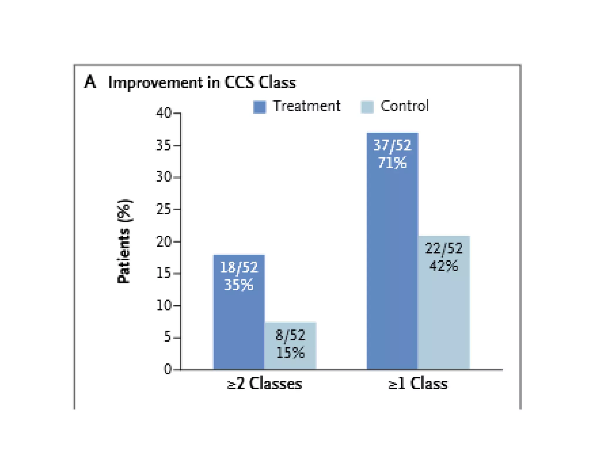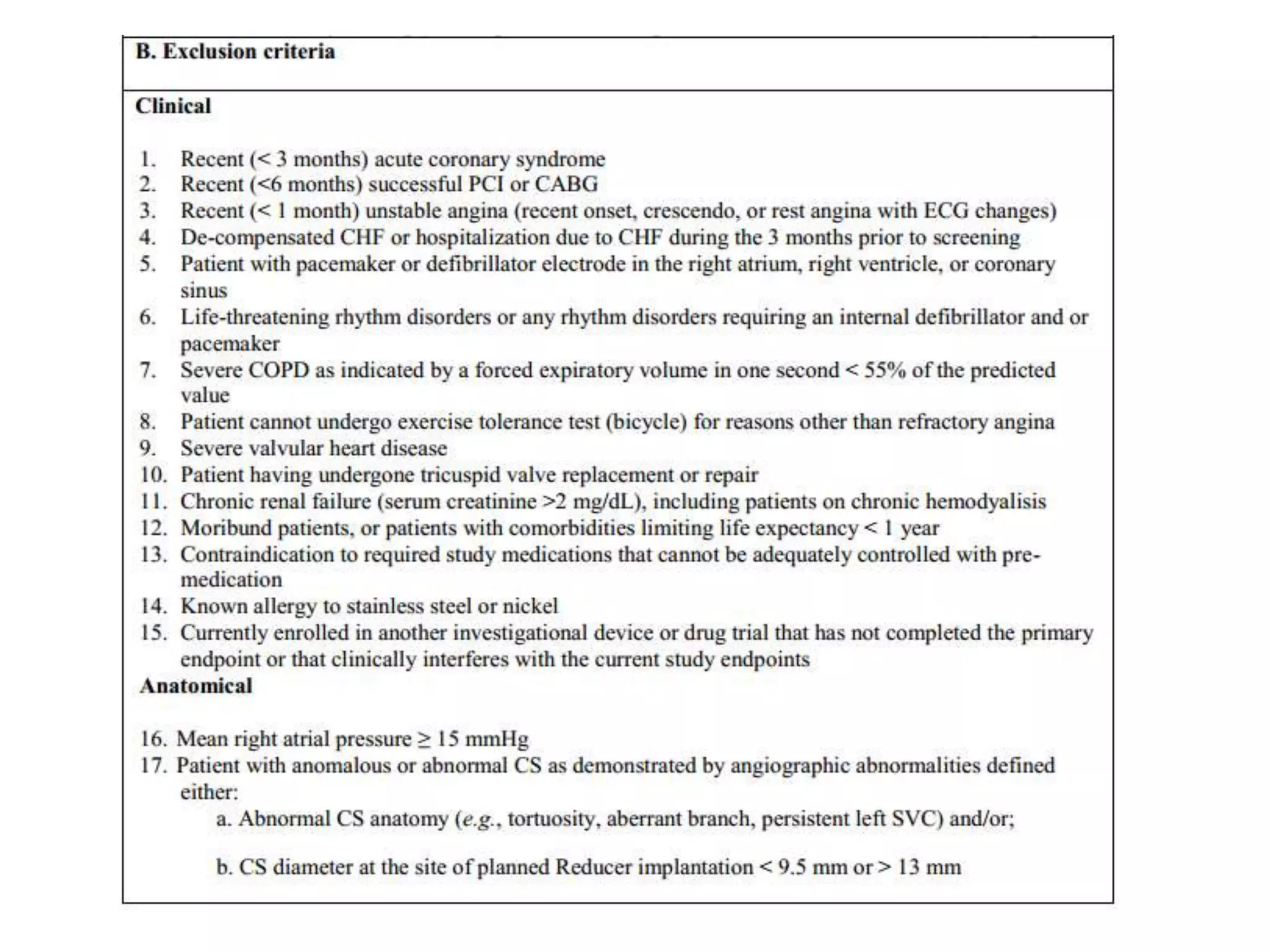 This document summarizes a clinical trial testing a coronary sinus reducing device for the treatment of refractory angina. The trial involved 104 patients randomized to receive the hourglass-shaped device, which creates pressure in the coronary sinus to redistribute blood flow, or a sham procedure. At 6-month follow-up, the device led to reduced angina symptoms and improved quality of life compared to the sham group, as measured by the Seattle Angina Questionnaire and Canadian Cardiovascular Society class. The results provide preliminary evidence that increasing coronary sinus pressure may help relieve angina by recruiting collateral blood flow.
