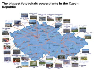 The document discusses alternative energy sources in the Czech Republic, including hydro, wind, solar, biomass, and biogas. Hydro energy comes from major dams like Orlík and Slapy as well as new storage hydro plants. Solar farms use countless photovoltaic panels. Wind energy requires altitude over 600 meters and is found in places like Jesenicko. Biomass combustion produces minimal CO2 and can be utilized at home, powering over 120,000 homes. Biogas produces electrical energy and heat from stations like Cicov, powering several thousand homes.