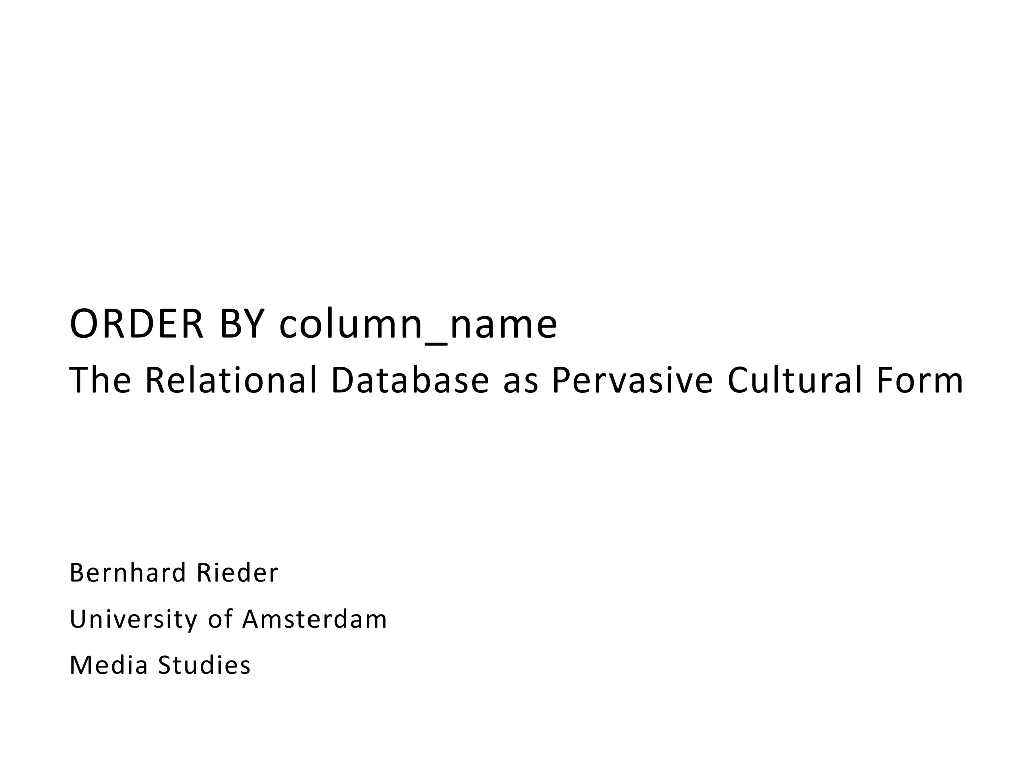 The document discusses the significance of relational database technologies within cultural and managerial contexts, highlighting their under-exploration in academic studies. It outlines key features of the relational model, such as data independence and logical declaration, and explores its implications for social practices and cognitive techniques. The relational model serves as a tool for enhanced calculative agency, impacting governance and organizational processes.