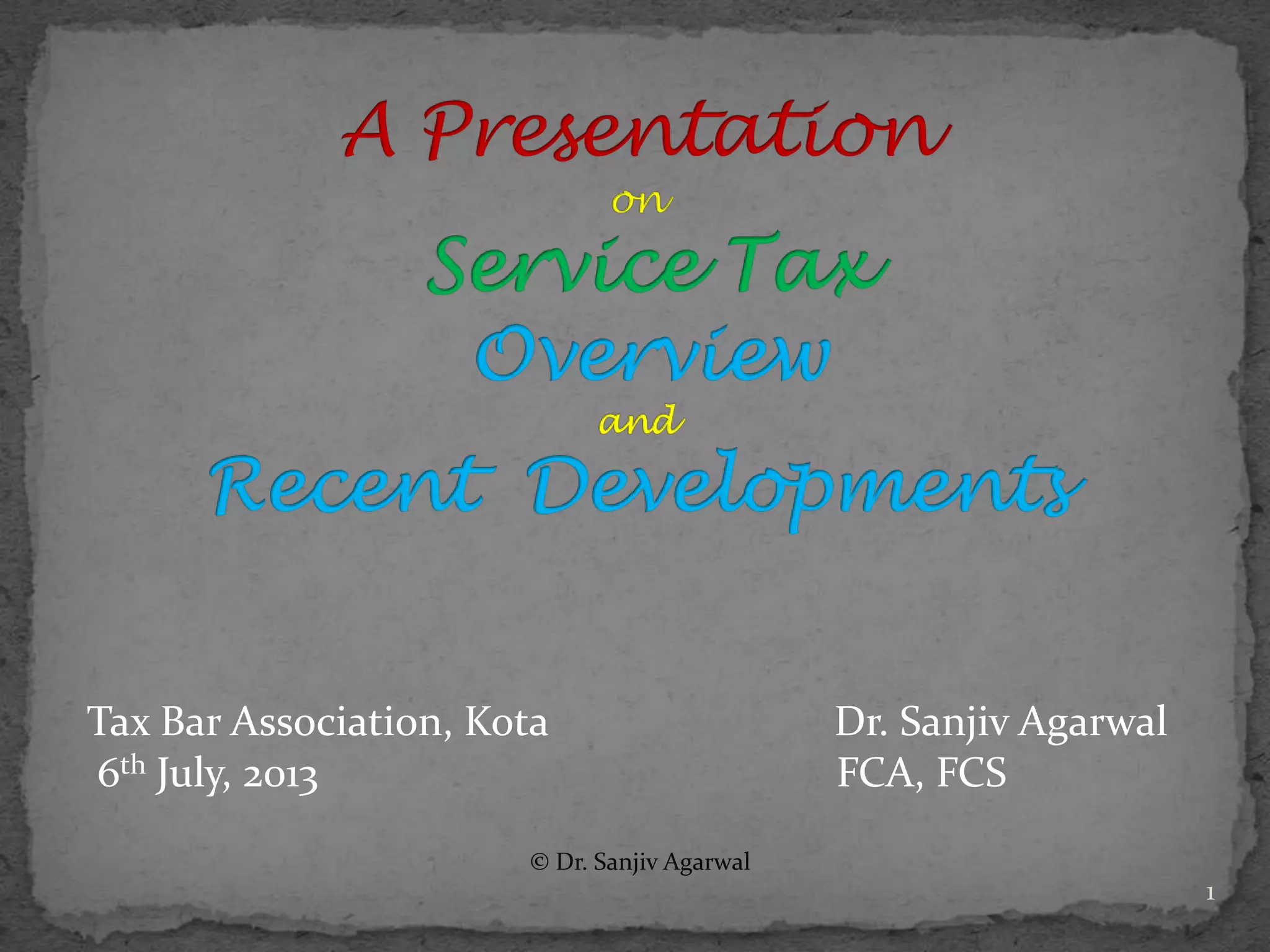 The document provides an overview of the Indian economy and service tax in India. It discusses the shift in 2012 to a negative list approach where all services are taxed unless specifically exempted. Key points include:
